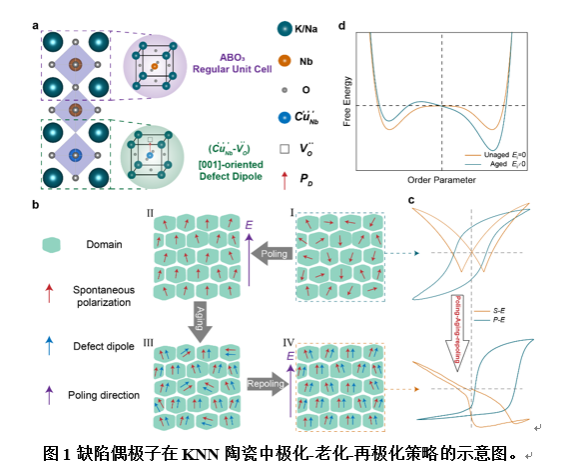 中大新闻网讯(通讯员金明革)高性能压电材料是研制新一代智能感知器件和精密驱动器件的关键。其中,铌酸钾钠基无铅压电陶瓷被认为是未来替代铅基压电材料的有力候选者。然而,传统无铅压电陶瓷材料存在电致应变较小(通常低于0.3%)和温度稳定性较差等问题,限制了其实际应用。近年来研究发现,缺陷偶极子对压电陶瓷的电学性能具有显著影响:一方面,缺陷偶极子可以通过钉扎效应抑制畴壁运动;另一方面,缺陷偶极子在电场下会产生显著响应。通过缺陷偶极子的拉伸实现超高的电致应变在近年来被广泛报道。然而,关于缺陷偶极子的形成机制及其与压电材料性能的关系仍未完全阐明;通过缺陷偶极子的设计,开发高性能的压电材料已成为研究的热点之一。