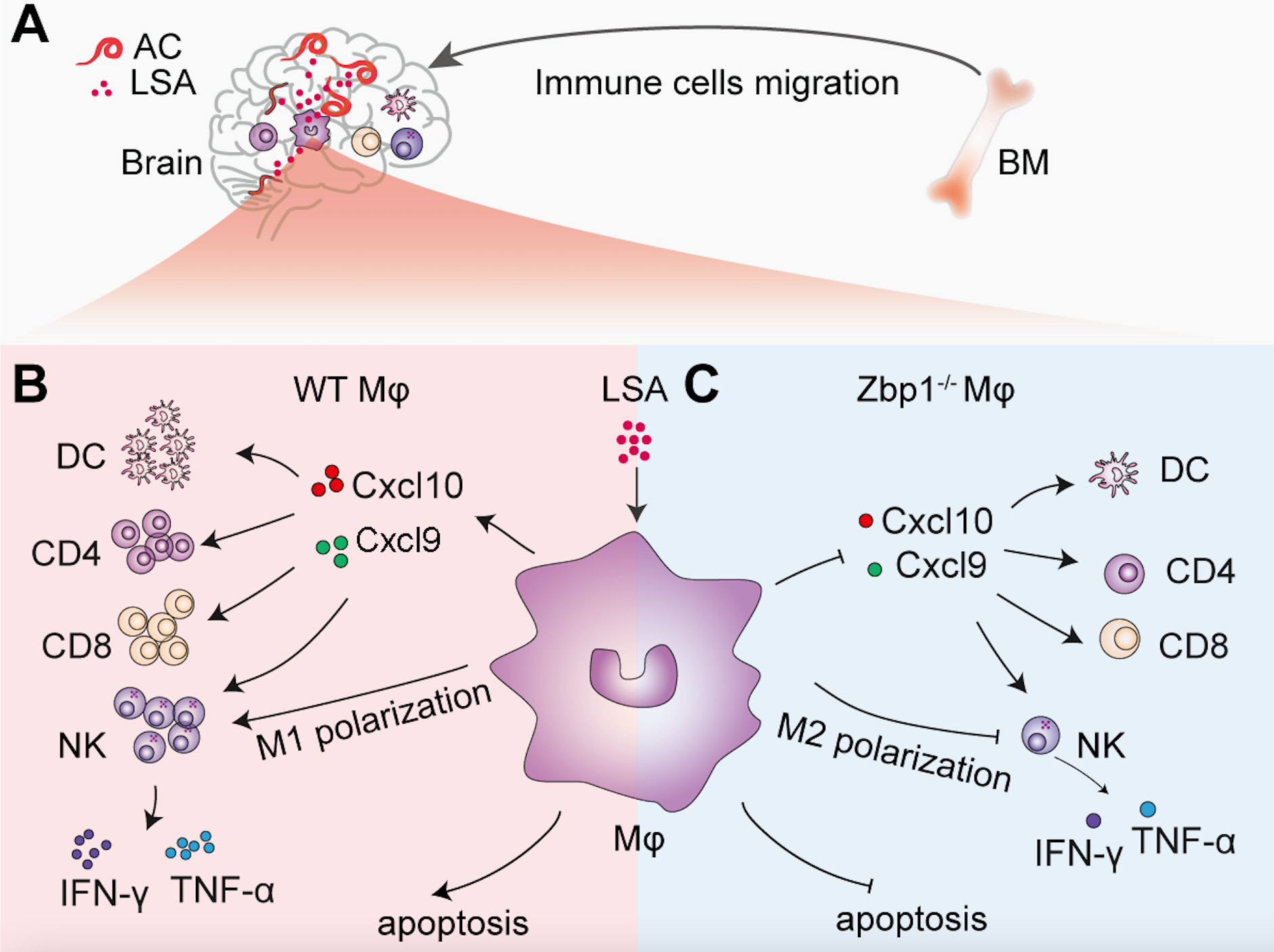 研究团队发现,在AC所致感染性脑炎模型中,骨髓来源的巨噬细胞Zbp1表达上调,并通过与RIPK3直接结合,激活RIP3-MLKL信号轴,促进巨噬细胞的凋亡、M1极化和趋化因子CXCL9与CXCL10的分泌,进而募集免疫细胞并激活CD8+ T细胞及NK细胞分泌TNF-α和IFN-γ,促进AC感染性脑炎的发生发展。而在AC感染的Zbp1敲除小鼠中,巨噬细胞M2型极化增强,凋亡减轻,淋巴细胞(CD4+ T、CD8+ T)浸润及NK细胞毒性显著降低,从而减轻中枢神经炎症反应。