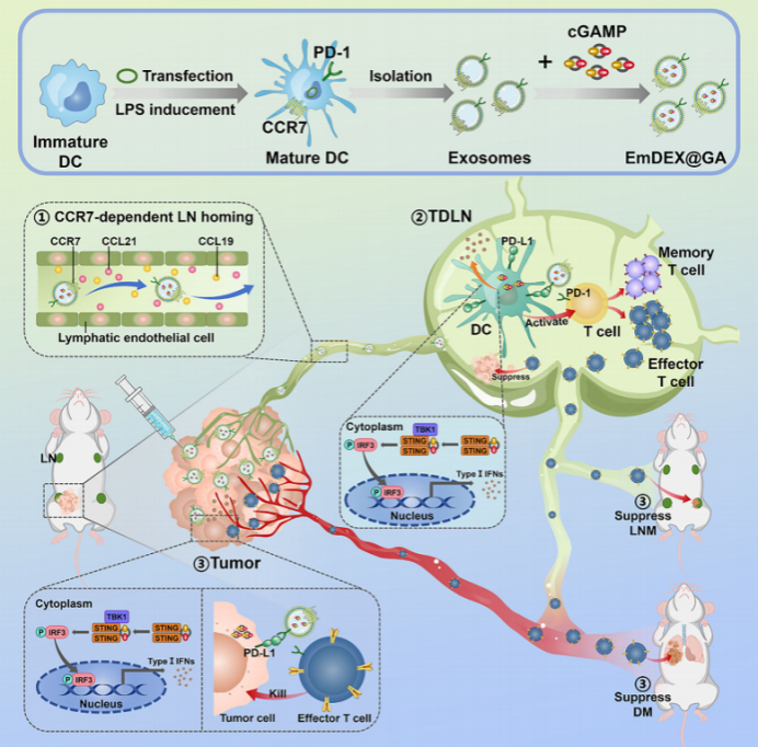 为此,团队研究构建工程化树突状细胞外泌体(EmDEX@GA),因其具备淋巴结迁移、免疫检查点阻断和信号通路激活功能。在小鼠原位肿瘤模型中,瘤内注射后,EmDEX@GA经CCR7靶向TDLN,阻断PD-L1与PD-1结合,激活 STING 通路,促进树突状细胞成熟和抗原呈递,解除 T 细胞免疫抑制,激发全身抗肿瘤免疫。周期性给药后,有效抑制肿瘤淋巴结及远处转移,其抑制效果不低于全身免疫检查点阻断治疗。