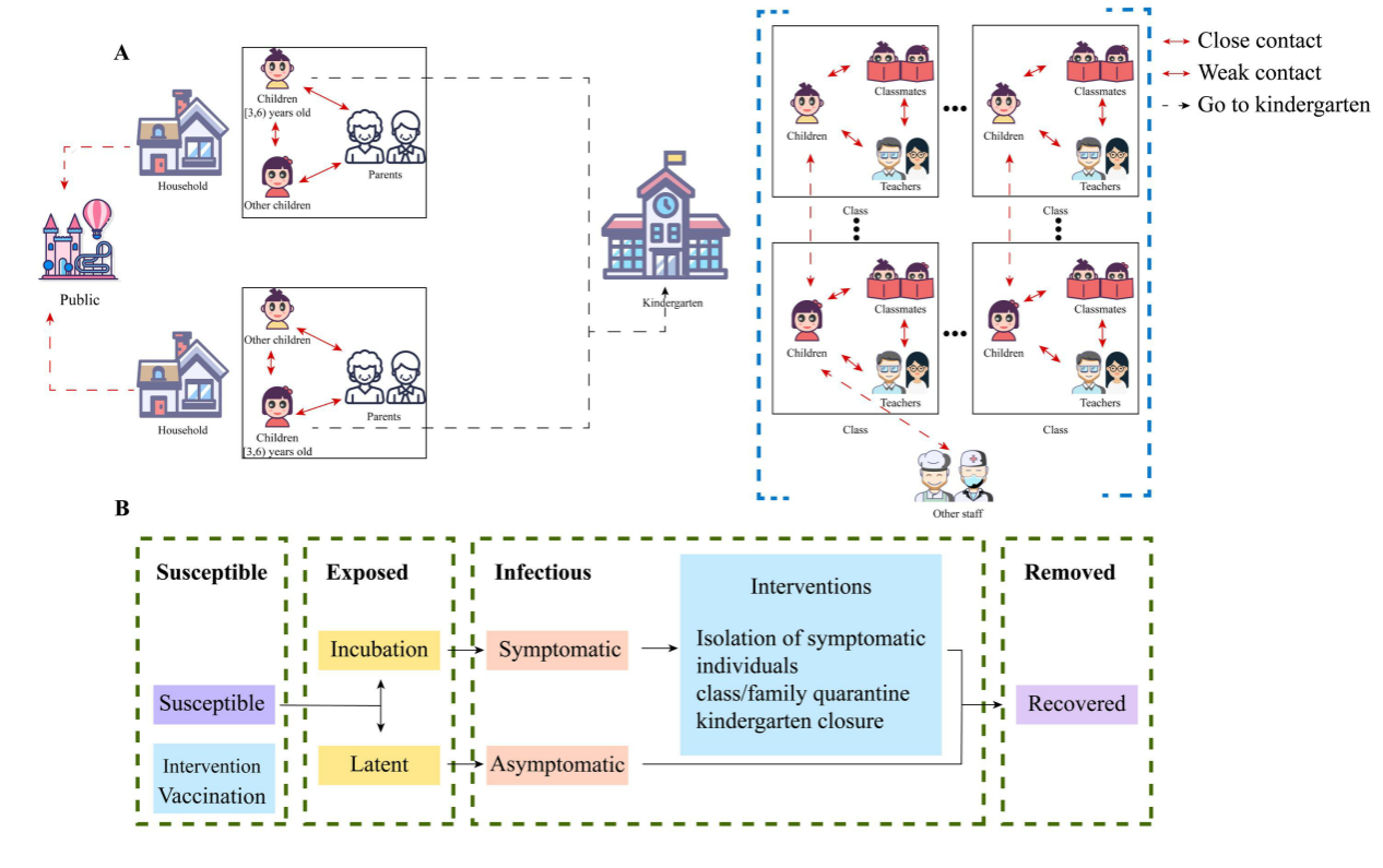 研究图形摘要:模型结构 A:接触图;B:传播模型及干预措施