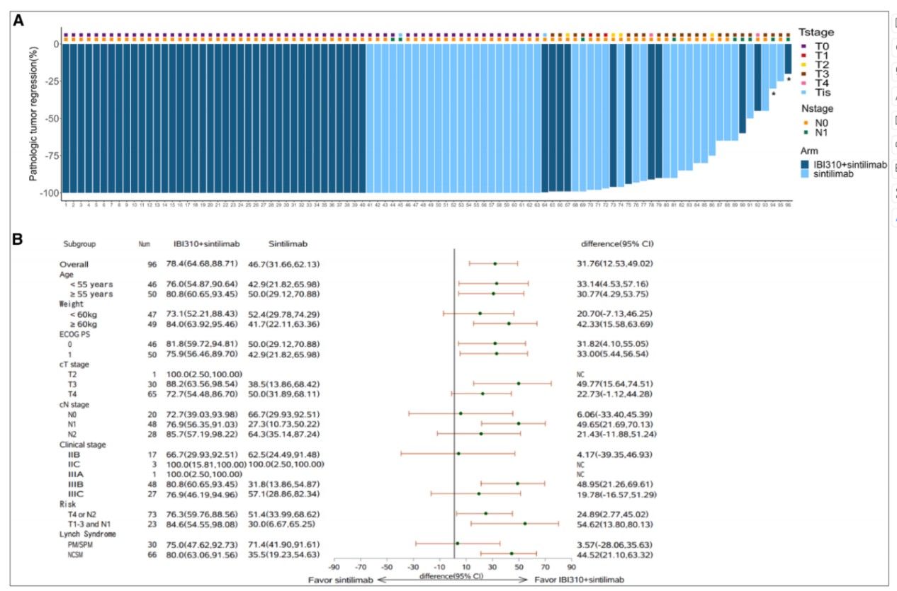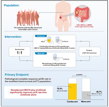 本研究是一项随机对照、开放标签、多中心1b期临床试验(NCT05890742),研究共纳入101名局部晚期可切除MSI-H/dMMR结肠癌患者,随机分配双免疫方案组(n=52),接受伊匹木单抗N01注射液(IBI310)+信迪利单抗治疗,共2个治疗周期;或单药组(n=49),接受信迪利单抗单药治疗。新辅助治疗后进行手术评估。主要终点为改良意向治疗人群(mITT)(接受至少一次新辅助治疗且完成手术)的pCR率,次要终点包括无事件生存期(EFS)、总生存期(OS)、R0切除率和安全性。