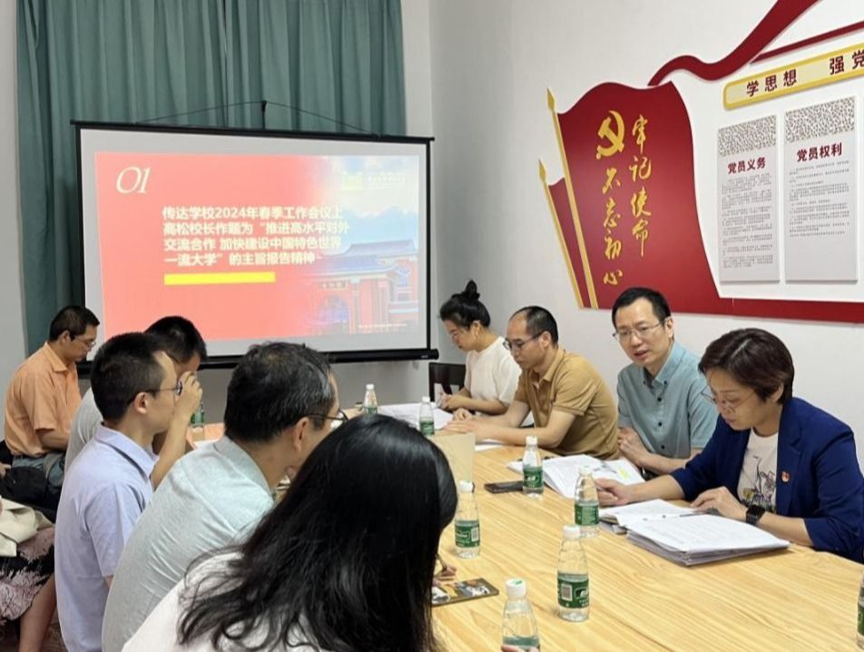 曾佳妮副书记传达了陈春声书记在2024年春季工作会议上的总结讲话精神。她指出,陈春声书记强调要充分发挥党组织领导作用,把党的领导贯穿到高水平对外交流合作的全方位和全过程,一是深入贯彻落实党的二十大精神,准确理解把握教育强国建设的战略布局和高水平对外交流合作的意义;二是坚持和加强党的领导,服务高质量发展,推动高水平对外交流合作取得新成效;三是坚持总体国家安全观,有效防范化解风险,为推动高水平对外交流合作提供坚强政治保证。曾佳妮副书记还传达了校党委副书记、纪委书记、国家监委驻best365中国官方网站监察专员刁振强警示教育专题报告精神,并开展纪律教育、师德师风教育、保密教育,以及师德警示教育。曾佳妮副书记强调,要深刻领悟习近平总书记的重要讲话精神和全国两会精神,以习近平外交思想为引领,深入学习领会学校春季工作会议精神,坚持和加强党的全面领导,确保党对教育对外开放的决策部署得到有力贯彻执行,确保学校高水平对外交流合作的战略措施得到有力落实;要高标准高质量开展党纪学习教育,切实把学习成果体现为推动事业发展的实际成效,为助力学校事业实现高质量内涵式发展作出新的更大贡献。
