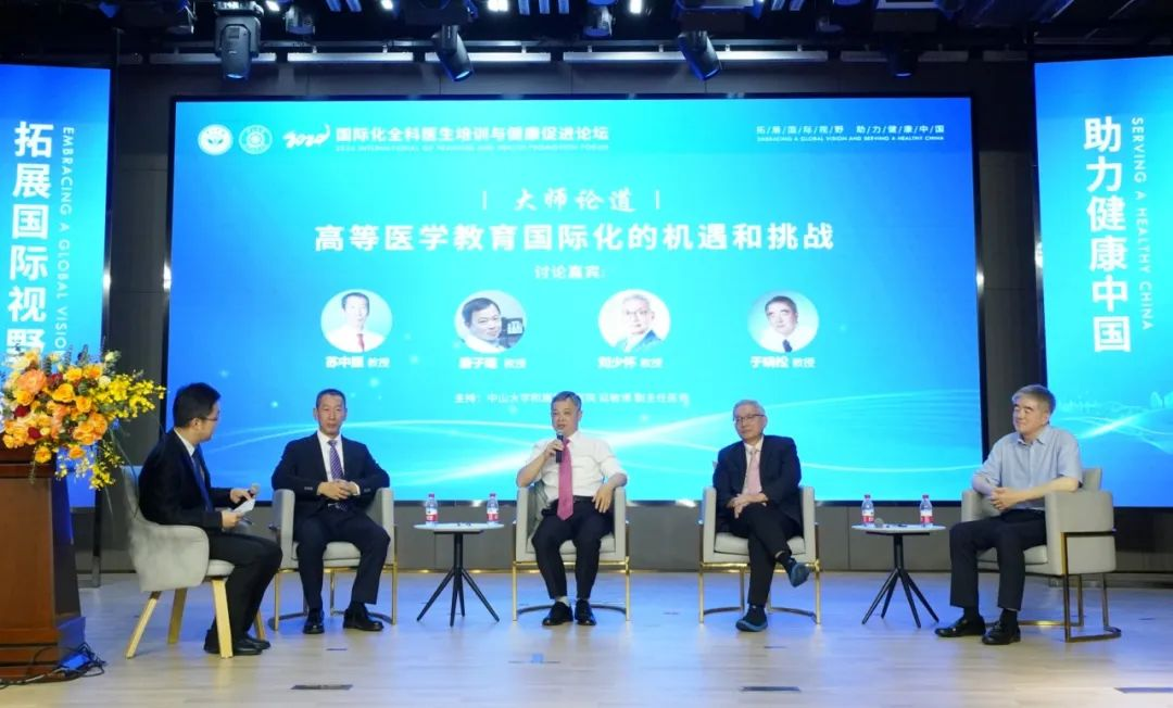在“大师论道”环节,美国凯撒医疗集团系主任唐子略教授,中华医学会全科医学分会前任主任委员、中国医科大学原副校长于晓松教授,英国皇家内科学院院士、香港大学中国商学学院客席副教授刘少怀,中大五院苏中振副院长围绕高等医学教育国际化面临的机遇和挑战展开深入交流讨论。