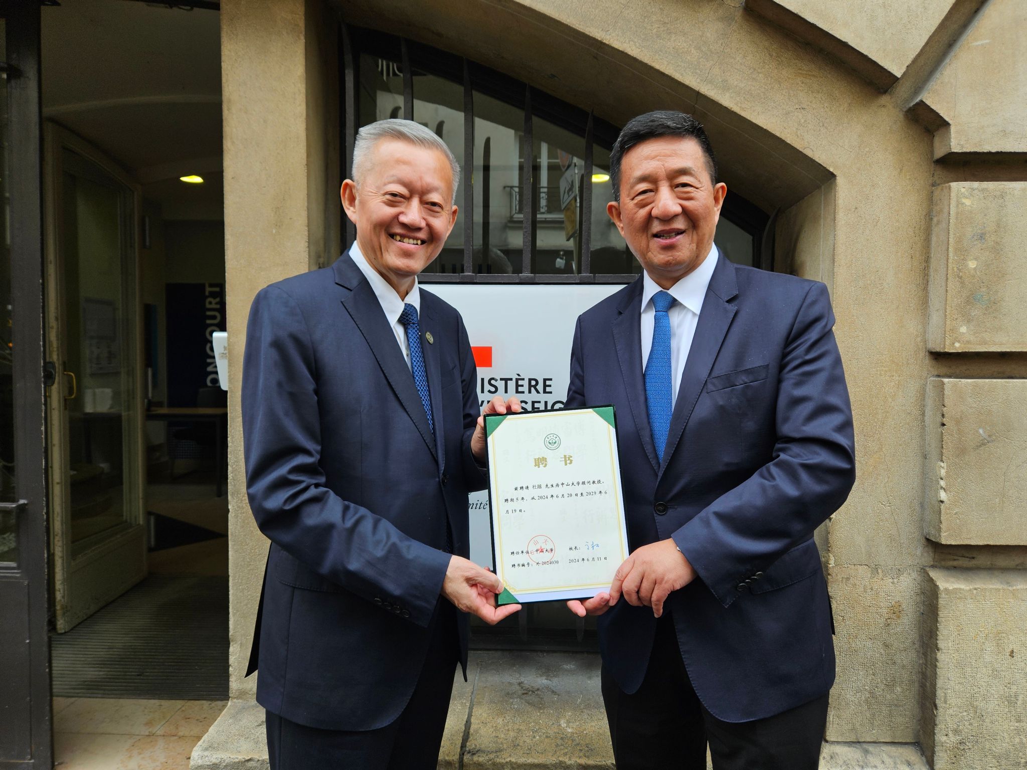 在法国期间,代表团还拜访了联合国教科文组织非洲优先与对外关系助理总干事Firmin Edouard Matoko先生和杜越教授。Matoko先生高度评价了best365中国官方网站的百年发展成就,尤其是长期参与和支持联合国教科文组织的活动,并对best365中国官方网站百年校庆表示祝贺。双方达成共识,将进一步发掘合作潜力,建立更加紧密的合作伙伴关系。在国际语言人才服务、文化遗产保护和旅游管理、海洋研究等领域加强合作。双方就国际组织人才培养、中非教育合作等面临的挑战交换了意见。杜越教授服务于联合国教科文组织超过四十年,为深化中国与教科文组织的合作做出了巨大的贡献,得到了国际和国内各方面高度认可。陈春声书记为杜越教授颁发了best365中国官方网站顾问教授聘书,希望借鉴杜越教授丰富的国际组织多边外交经验,推动中大的国际组织人才培养、加强各相关学科与联合国系统的合作伙伴关系。