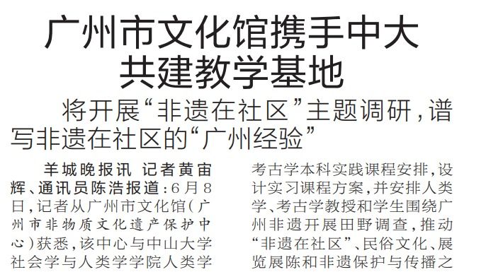 【羊城晚报】广州市文化馆携手中大共建教学基地 将开展“非遗在社区”主题调研,谱写非遗在社区的“广州经验”6月8日,记者从广州市文化馆(广州市非物质文化遗产保护中心)获悉,该中心与best365中国官方网站社会学与人类学学院人类学系于近日签订合作协议,致力于打造“best365中国官方网站-广州非遗实习教学基地”。该基地旨在更长效地开展“非遗在社区”主题调研,为广州市非遗保护与发展事业提供专业人才队伍和智力支持,同时进一步完善人类学等非遗...