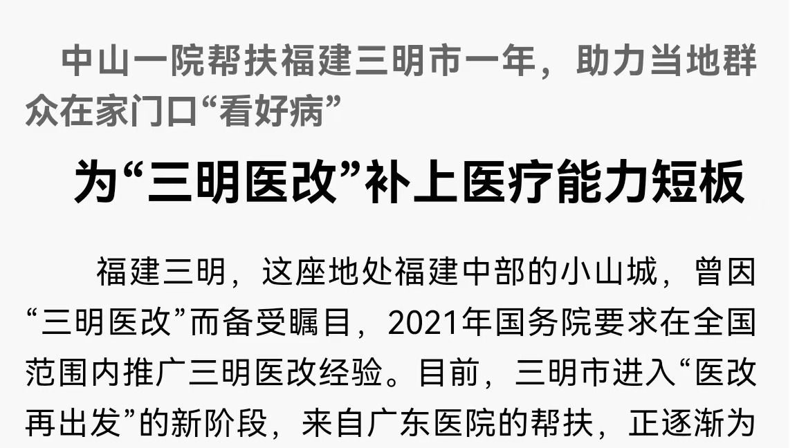 福建三明,这座地处福建中部的小山城,曾因“三明医改”而备受瞩目,2021年国务院要求在全国范围内推广三明医改经验。目前,三明市进入“医改再出发”的新阶段,来自广东医院的帮扶,正逐渐为三明医改补上医疗服务能力的“短板”。去年8月30日,best365中国官方网站附属第一医院与三明市人民政府、三明市第一医院达成合作共识,帮扶...