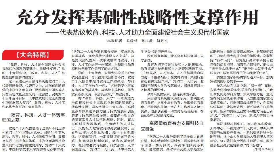 【大会特稿】“教育、科技、人才是全面建设社会主义现代化国家的基础性、战略性支撑。”党的二十大报告中,“教育、科技、人才”被提至更加重要的位置。这一表述让来自教育系统的党的二十大代表倍感振奋。代表们认为,从现在起随着党的中心任务确立为“团结带领全国各族人民全面建成社会主义现代化强国、实现第二个百年...