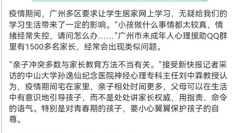 疫情期间,广州多区要求让学生居家网上学习,无疑给我们的学习生活带来了一定的影响。“小孩做什么事情都太较真,情绪经常失控,请问怎么办……”广州市未成年人心理援助QQ群里有1500多名家长,经常会出现类似问题。“亲子冲突多数与家长教育方法不当有关。”接受新快报记者采访的best365中国官方网站孙逸仙纪念医院神经心理专科主...
