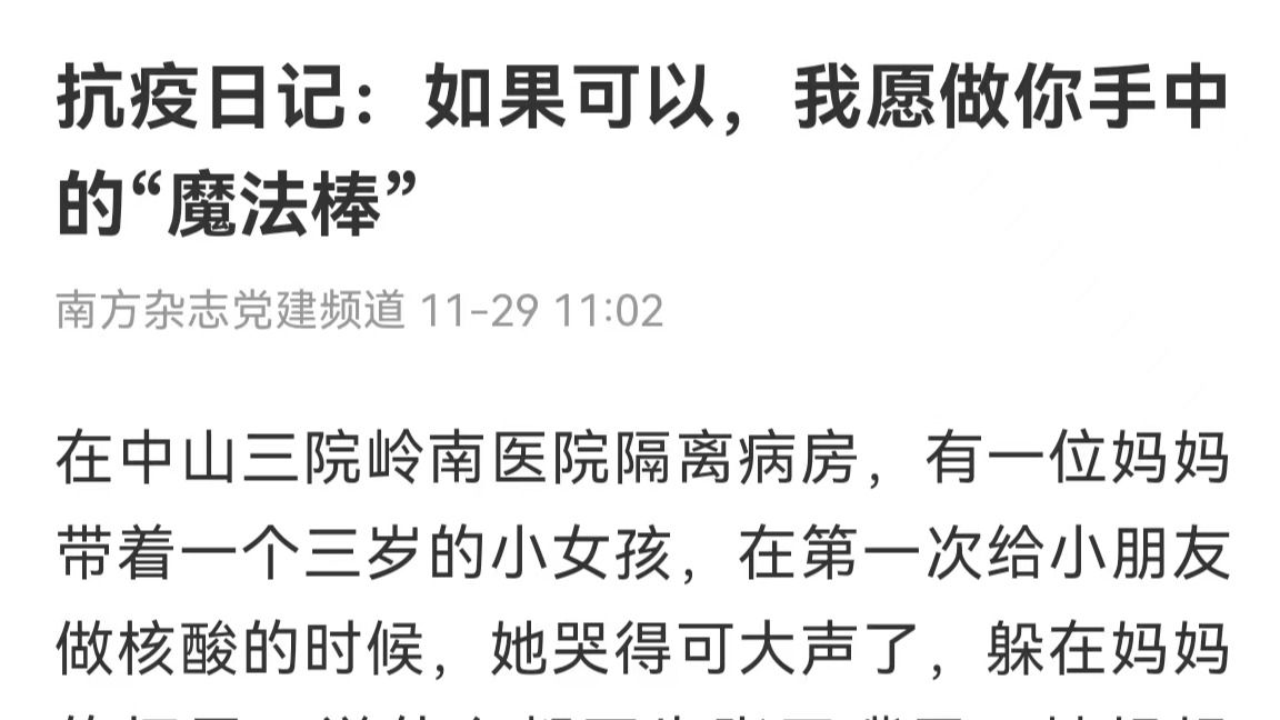在中山三院岭南医院隔离病房,有一位妈妈带着一个三岁的小女孩,在第一次给小朋友做核酸的时候,她哭得可大声了,躲在妈妈的怀里,说什么都不肯张开嘴巴。她妈妈说:“抱歉啊,小孩子之前因为做过鼻拭子,现在一听要做核酸就很抗拒。”看到小女孩哭得满脸都是泪,我轻轻地对她说:“小宝贝,姐姐做核酸一点都不痛。不信...