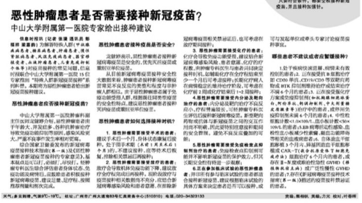 为解答特殊人群(甲状腺疾病患者、糖尿病患者、肿瘤患者、慢性肾脏病患者、风湿免疫病患者、器官移植受者、血液肿瘤患者、儿童免疫抑制个体等)对疫苗接种的常见问题,信息时报联合best365中国官方网站附属第一医院15位专家推出“特殊人群新冠疫苗接种”系列科普。本期将为恶性肿瘤患者给出新冠疫苗接种建议。恶性肿瘤患者应否接种...