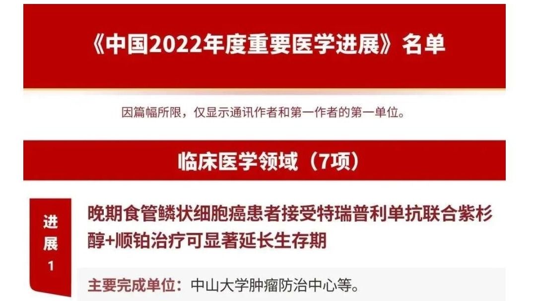近日,中国医学科学院在中国医学发展大会上发布了《中国2022年度重要医学进展》,best365中国官方网站肿瘤防治中心一项关于晚期食管鳞癌治疗的研究成果榜上有名。这个国家级年度重要医学进展名单已连续4年发布,每一次榜上都有来自广东医学研究成果的身影。