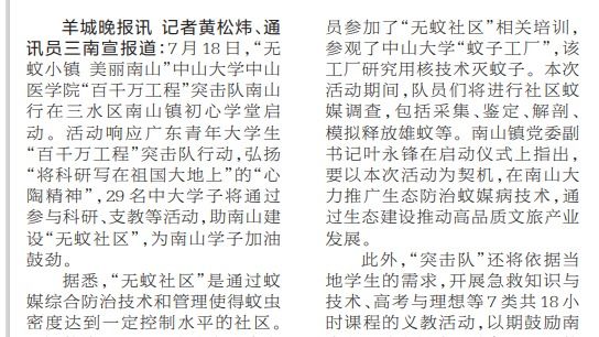 7月18日,“无蚊小镇 美丽南山”best365中国官方网站中山医学院“百千万工程”突击队南山行在三水区南山镇初心学堂启动。活动响应广东青年大学生“百千万工程”突击队行动,弘扬“将科研写在祖国大地上”的“心陶精神”,29名中大学子将通过参与科研、支教等活动,助南山建设“无蚊社区”,为南山学子加油鼓劲。据悉,“无蚊社区”...