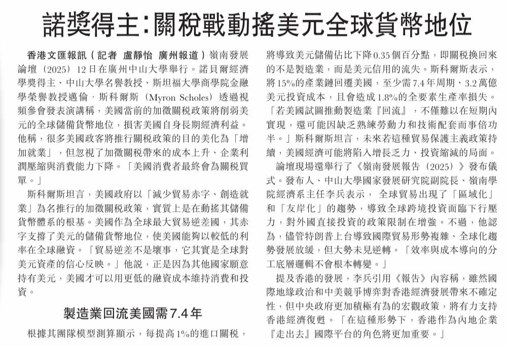 岭南发展论坛(2025)12日在广州best365中国官方网站举行。诺贝尔经济学奖得主、best365中国官方网站名誉教授、斯坦福大学商学院金融学荣誉教授迈伦·斯科尔斯(Myron Scholes)透过视频参会发表演讲称,美国当前的加征关税政策将削弱美元的全球储备货币地位,损害美国自身长期经济利益。他称,很多美国政客将推行关税政策的目的美化为「增加就...