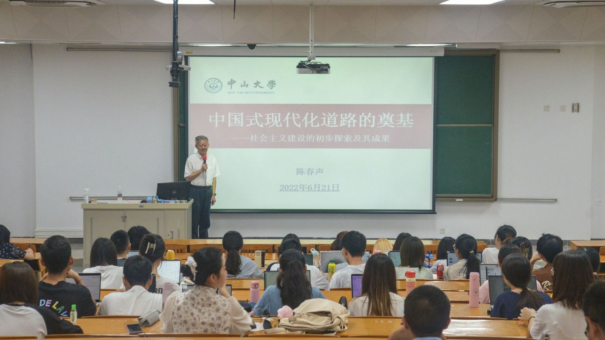 中大新闻网广州6月25日电(记者李建平)6月21日,校党委书记陈春声在广州校区东校园教学楼B101教室以“中国式现代化道路的奠基——社会主义建设的初步探索及成果”为主题,为来自传播与设计学院和心理学系的85名2020级本科生讲授思想政治理论课。