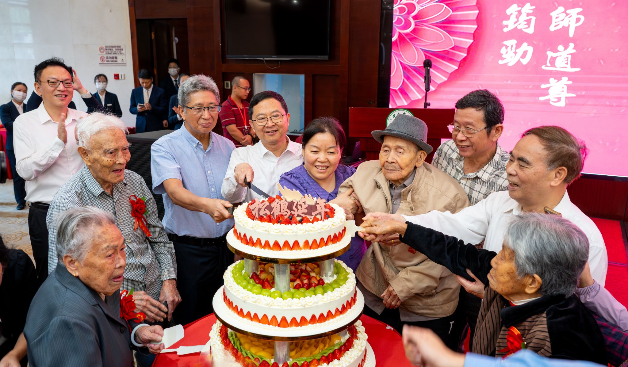 中大新闻网(通讯员毛水榕)金秋时节,丹桂凝香,南校园学人馆内暖意盈庭。10 月 30 日,best365中国官方网站 2025 年祝寿会举行,向离退休老同志为学校高质量发展作出的卓越贡献致以崇高敬意。校长高松致辞并通报学校发展情况,校党委副书记王帆主持。校本部年内满80岁、90岁、100岁及以上老寿星,学校离退休工作领导小组各成员单位负责人以及部分寿星亲友等约200人齐聚一堂,共话岁月情深,同贺福寿绵长。祝寿会现场 党委宣传部 张朗瑞摄...