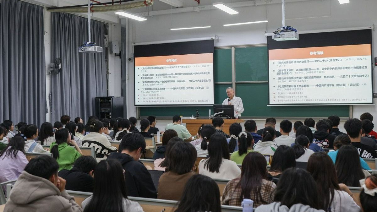 中大新闻网广州3月7日电(记者孙琛)3月6日晚上,学校党委书记陈春声教授来到广州校区南校园丰盛堂C101教室,在“习近平新时代中国特色社会主义思想概论”课堂上为政治与公共事务管理学院2022级的106名本科生讲授“思政第一课”,宣讲党的二十大精神。