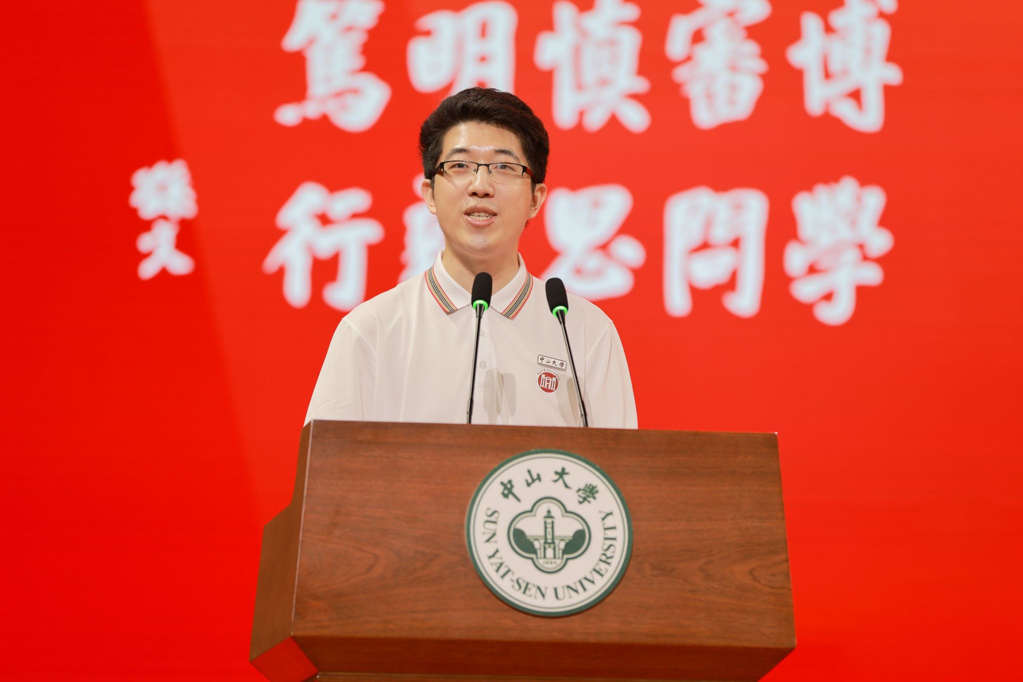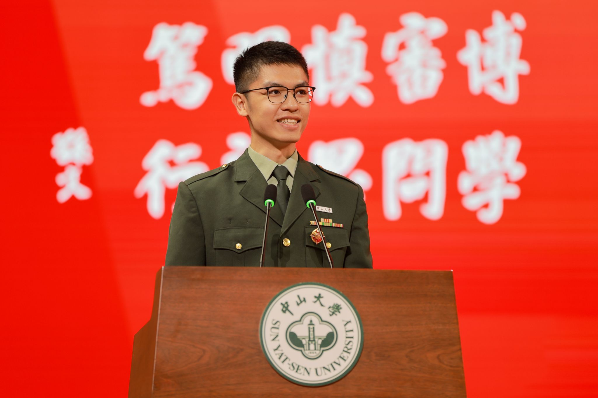 Zhong Ruiqi, a new graduate student from School of Government, shared his unique experience of returning to university after serving in the military. He stated that his time in the armed forces instilled in him a sense of duty, responsibility and resilience, which he will carry forward to pursue academic achievements. He encouraged his fellow students to pass down the “Red genes” and patriotism inherited in SYSU, serving the nation’s needs.