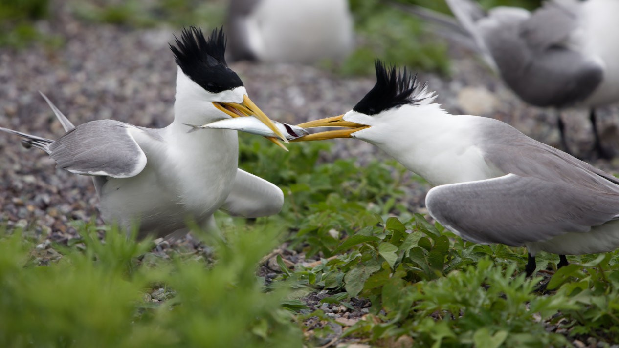 Great crested terns competing for food. | Photo provided by Prof. Liu Yang, School of Ecology (Photo by Zhou Danyang)
