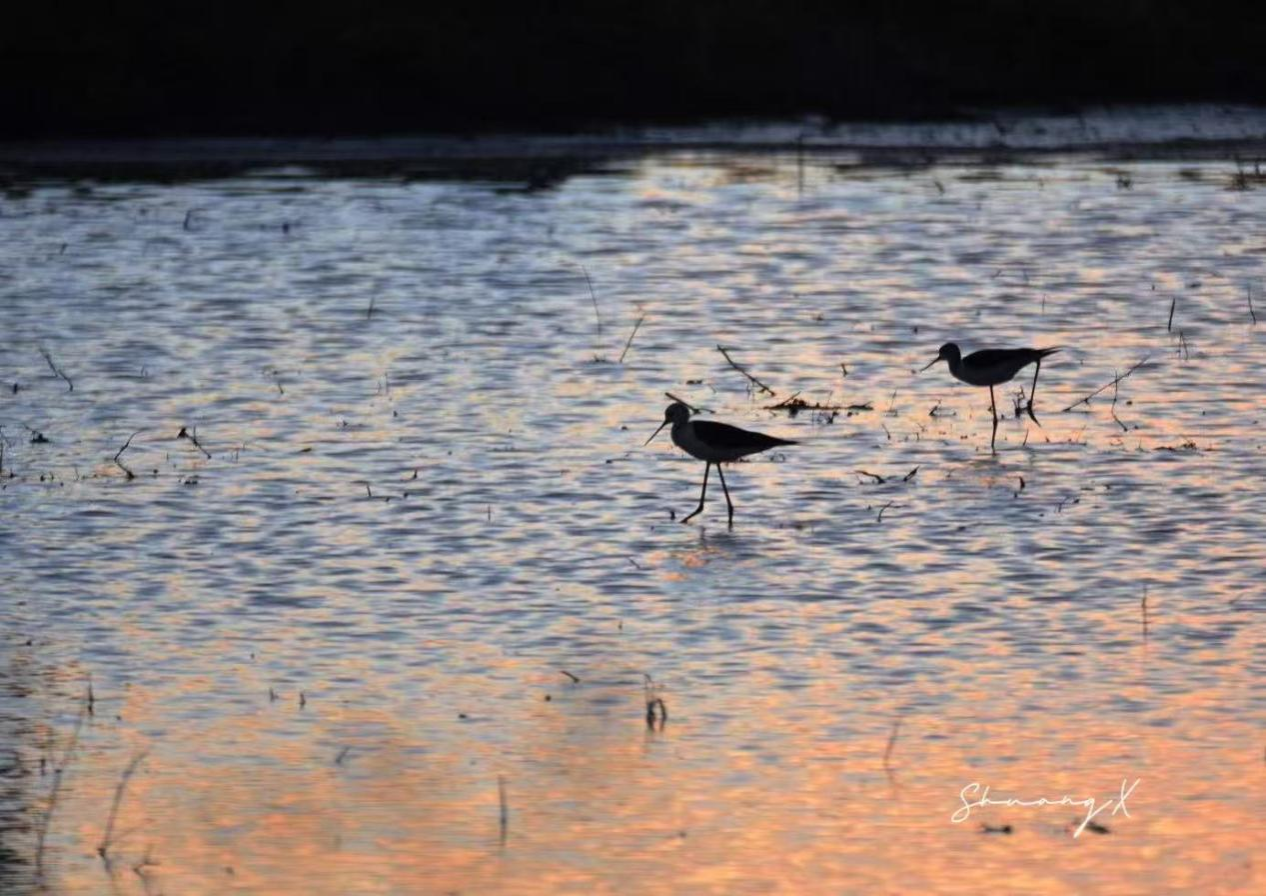 Black-winged stilts at dusk. | Photo by Vice Prof. Xing Shuang, School of Ecology