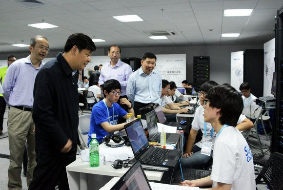 Vice Minister Du Zhanyuan talking with contestants from Ulsan National Institute of Science and Technology on the competition site of ASC14