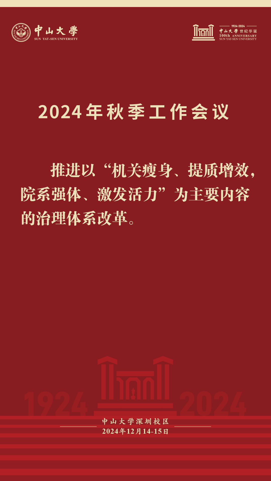 本次秋季工作会议为期两天。在后续的议程中,14日下午教务部、研究生院、科学研究院、人力资源管理处负责人进行专题报告,发展规划办公室、财务处、总务部、政治与公共事务管理学院、数学学院、中山医学院、地球科学与工程学院、先进制造学院负责人代表机关部处和院系围绕完善内部治理体系进行发言。14日晚上与会人员按学部分组讨论。15日上午,各分组召集人代表将结合大会报告、分组讨论情况在会上发言。