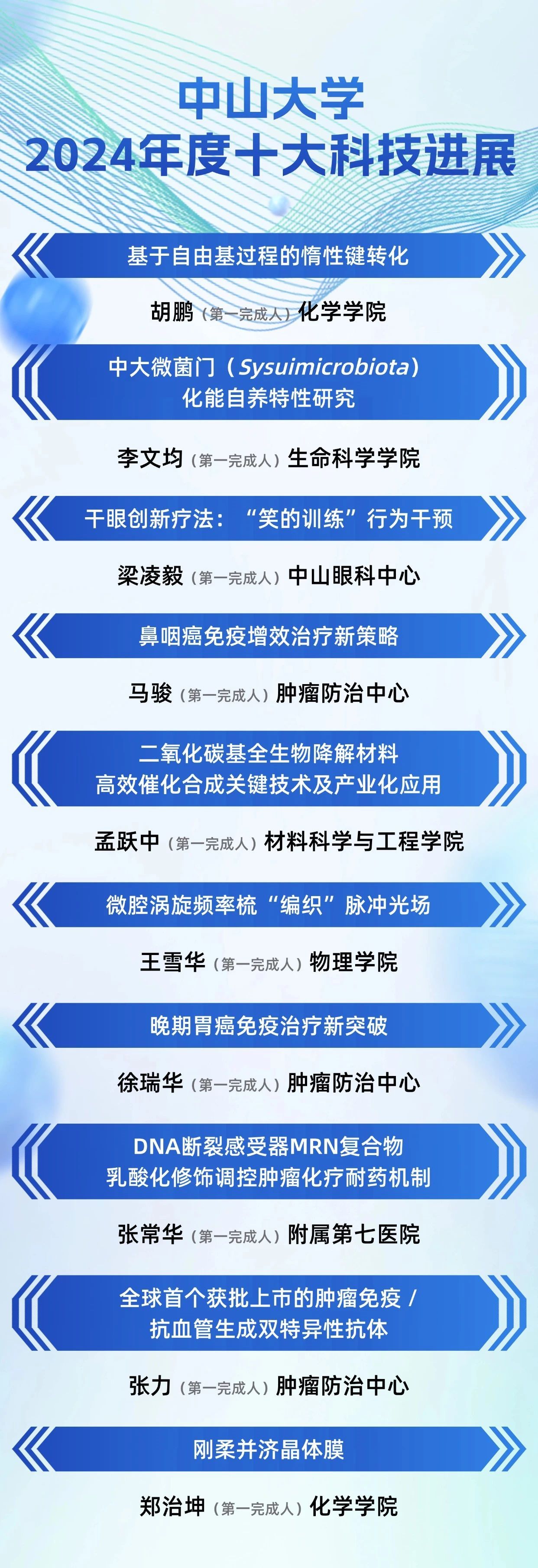 会上公布了best365中国官方网站2024年度十大科技进展,10项成果分为基础研究、应用研究和科技转化三大类别,覆盖肿瘤、眼科、物理、化学、材料、微生物等多领域前沿研究,相关成果在世界顶级期刊发表或已在业界开始应用。