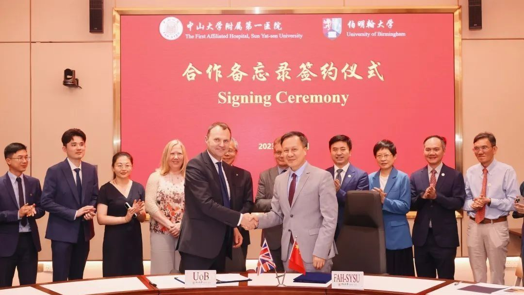 A delegation from the University of Birmingham (UoB) visited the First Affiliated Hospital of Sun Yat-sen University (FAH-SYSU) in Guangzhou's Nansha on June 20. A memorandum of understanding (MOU) was signed to further cooperation on healthy aging research.