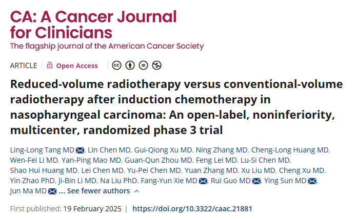 On February 20, a groundbreaking clinical trial led by Academician Jun Ma, Prof. Ying Sun and Prof. Linglong Tang from Sun Yat-sen University Cancer Center (SYSUCC), was published in CA: A Cancer Journal for Clinicians (Impact Factor: 503.1), the world’s most influential oncology journal.The trial, a phase Ⅲ study on reduced-volume vs. conventional radiotherapy after induction chemotherapy in...