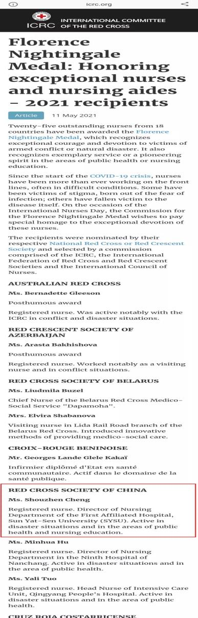Prof. Cheng Shouzhen from FAH-SYSU Awarded Florence Nightingale Medal