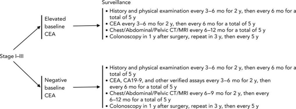 According to the NCCN Clinical Practice Guidelines for Rectal Cancer, serum CEA is a crucial test in surveillance for rectal cancer after treatment, and serial CEA elevation is regarded as a strong marker for potential recurrence that requires more examination or intensive surveillance to confirm it (Figure 1).