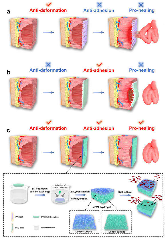 Figure 1. Schematic illustration of structure and abdominal wall defect repair properties for a) conventional PP mesh, b) classical PCO mesh, and c) our JPVA hydrogel patch, which is prepared through top-down solvent exchange, lyophilization and rehydration. a) Conventional PP mesh has excellent anti-deformation property, but usually causes severe visceral adhesion and undesirable defect healing. b) Classical PCO mesh can prevent visceral adhesion, but suffers from deformation and undesirable defect healing. c) Due to its Janus porous structure and high hydrogen bond crosslinking density, our JPVA hydrogel has unique asymmetry cell adhesion behaviors, excellent mechanical and anti-swelling properties, and thus demonstrates properties of anti-adhesion, pro-healing and anti-deformation simultaneously, leading to superior repair effect of abdominal wall defect.