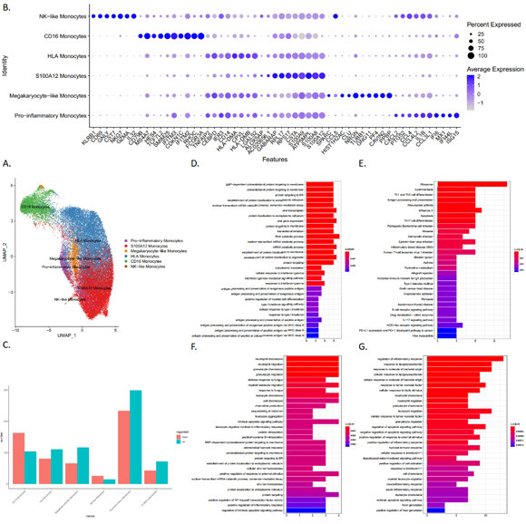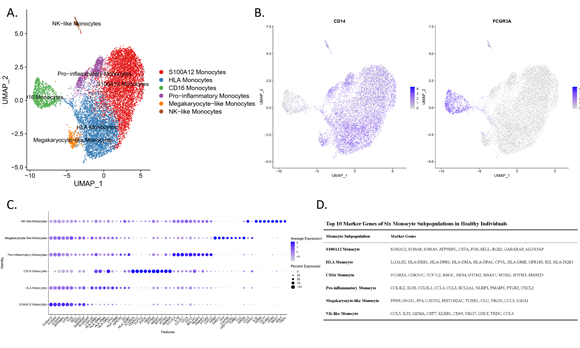 The study identified six populations with two previously unreported subsets according to similarities and differences in transcriptome profiles: 1) The S100A12 monocytes represented the commonalities among CD14high monocytes and expressed hallmark proinflammatory. 2) HLA monocytes expressed the MHC Class II molecules LGALS2 and CPVL. 3) CD16 monocytes were a nonclassical population. 4) Proinflammatory monocytes presented a unique combination of genes, including chemokine ligands, interleukins, and nod-like receptors associated with virus infection, the inflammatory process, and pyroptotic cell death mediators. 5) Megakaryocyte-like monocytes expressed genes similar to megakaryocyte progenitors (including PPBP and PF4). 6) NK cell-like monocytes expressed a cytotoxic gene signature and shared other differentially expressed genes with NK cells.