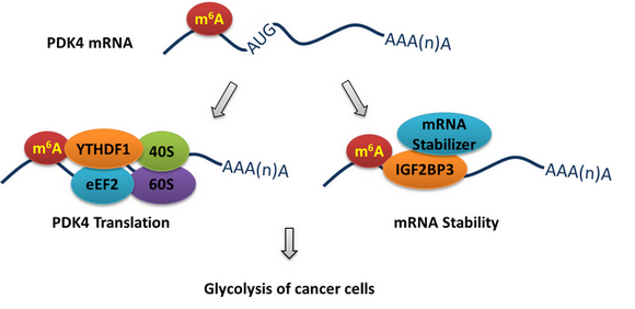 In this study, the research group found that the m6A modification of RNA has a positive regulatory effect on the energy metabolism of tumor cells. It can participate in glycolysis and ATP production of tumor cells through pyruvate dehydrogenase kinase 4 (PDK4). Particularly, m6A modified 5’UTR of PKD4 positively regulates its translation elongation and mRNA stability via binding with YTHDF1/eEF-2 complex and IGF2BP3, respectively. Further, TATA-binding protein (TBP) can transcriptionally increase the expression of Mettl3 in cervical cancer cells via binding to its promoter. In vivo and clinical data confirm the positive roles of m6A/PDK4 in tumor growth and progression of cervical and liver cancer. This study reveals that m6A regulates glycolysis of cancer cells through PDK4.