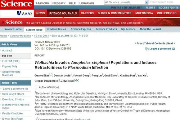 Anopheles stephensi (vector of malaria in Middle East and South Asia) by scientists. The infected female Anopheles would pass the bacteria to her offspring, and all mosquitoes would not be infected with malaria parasites after 8 generations. The study was conducted by Professor Zhiyong Xi, the director of SYSU-MSU Joint Center of Vector Control for Tropical Disease. Guowu Bian, a professor of Key Laboratory for Tropical Disease Control of Sun Yat-sen University and Department of Parasitology of Zhongshan School of Medicine, is the first author of the paper.