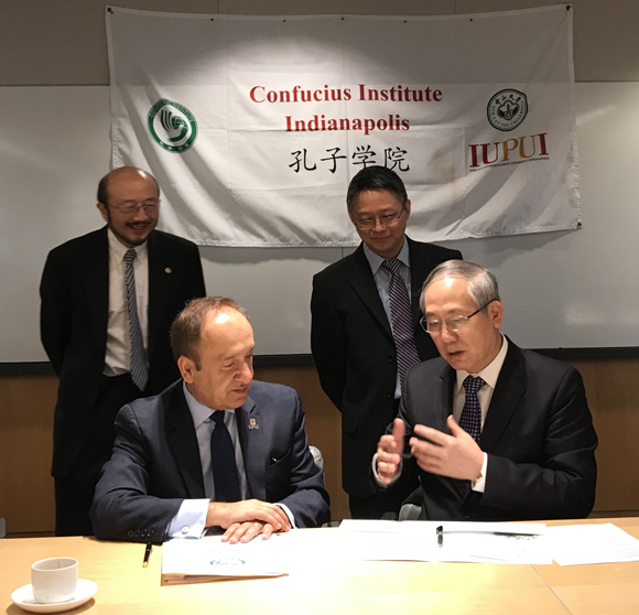 On June 23, President Luo Jun visited IUPUI, and attended the Confucius Institute Advisory Board Meeting and the TianQin Project cooperation meeting. He affirmed the efforts and achievements of the Confucius Institute in promoting Chinese language and culture, and hoped to further deepen cooperation between the two universities. Afterwards, President Luo Jun attended the TianQin Project cooperation meeting, and held discussions with representatives from the Department of Physics at IU and IUPUI on relevant research in gravitational waves. After the meeting, President Luo Jun and IUPUI Chancellor Nasser Paydar signed an Addendum to the Sub-Agreement for the Cooperation on the TianQin Project.