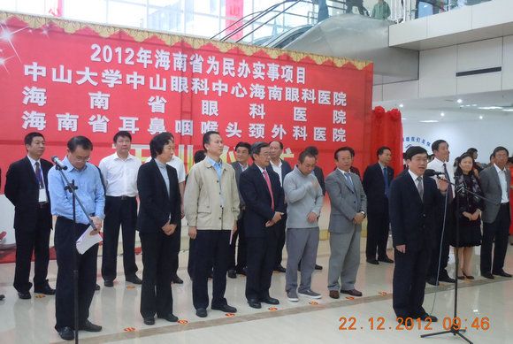 The grand opening ceremony of “Sun Yat-sen University Zhongshan Ophthalmic Center Hainan Provincial Ophthalmic Hospital” and Hainan Provincial Otolaryngology-Head and Neck Surgery Hospital (also named as “Sun Yat-sen University Hainan Provincial Otolaryngology-Head and Neck Surgery Hospital”) was held in Haikou City, Hainan Province on the morning of December 22, 2012. The two hospitals are entrusted by the People’s Government of Hainan Province with the former managed by Zhongshan Ophthalmic Center and the latter technically supported by the First Affiliated Hospital of Sun Yat-sen University. Lin Fanglue, Vice Governor of Hainan Province; Wang Yu, Director of the Medical Administration Department of the Ministry of Health; Xu Ningsheng, President of SYSU; Wang Jiangping, Executive Vice President of SYSU; Li Ping, Deputy Secretary of SYSU; Bai Zhiqin, Director of the Department of Health of Hainan Province; Han Yingwei, Secretary of the Party Leadership Group and Deputy Director of Department of Health of Hainan Province; Xing Liyuan, Chairman of Hong Kong Yan’ai Fund; Yan Churong, Secretary of the Party Committee of the First Affiliated Hospital of SYSU, Liu Yizhi, Director of Zhongshan Ophthalmic Center; Yu Minbin, Secretary of the Party Committee of Zhongshan Ophthalmic Center; relevant persons in charge and other guests attended the ceremony. The opening ceremony was presided over by Feng Ming, Deputy Secretary-General of Hainan Provincial People's Government.
