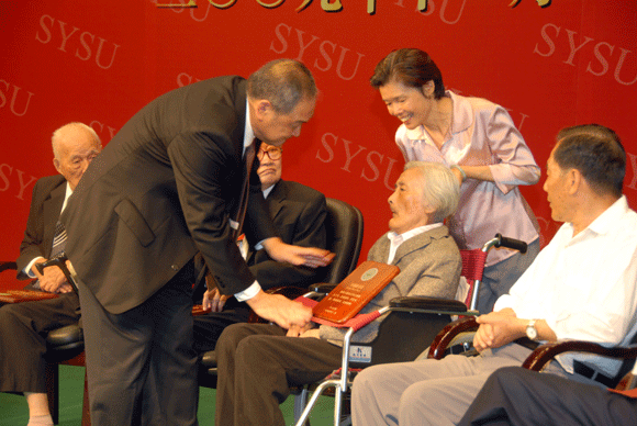 Zhen Detao, the Secretary of the Party Committee of SYSU, awarded the prize to Professor Fu Jiarui.