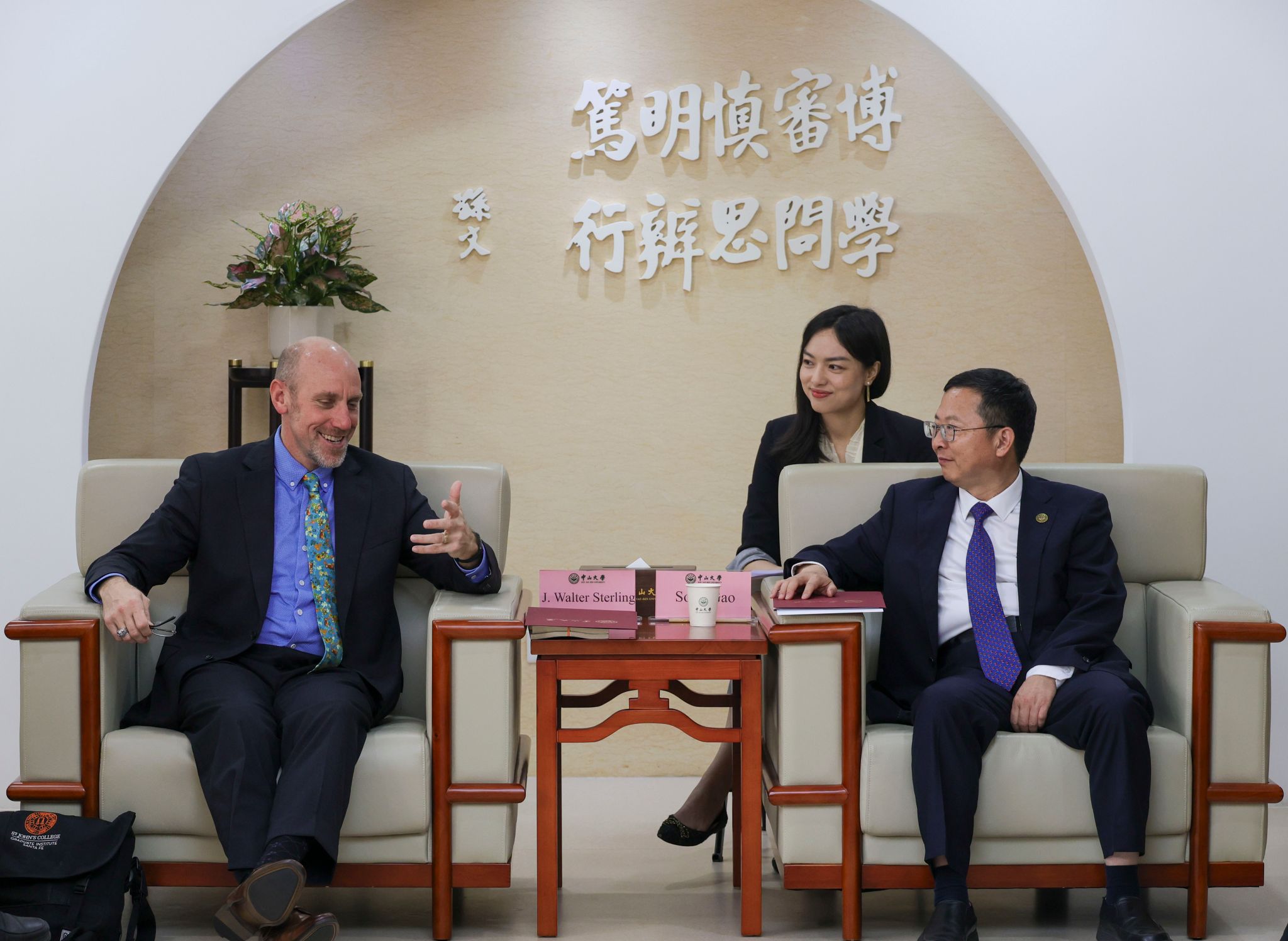 J. Walter Sterling (left), president of St. John's College, talks with Gao Song (right), president of SYSU.