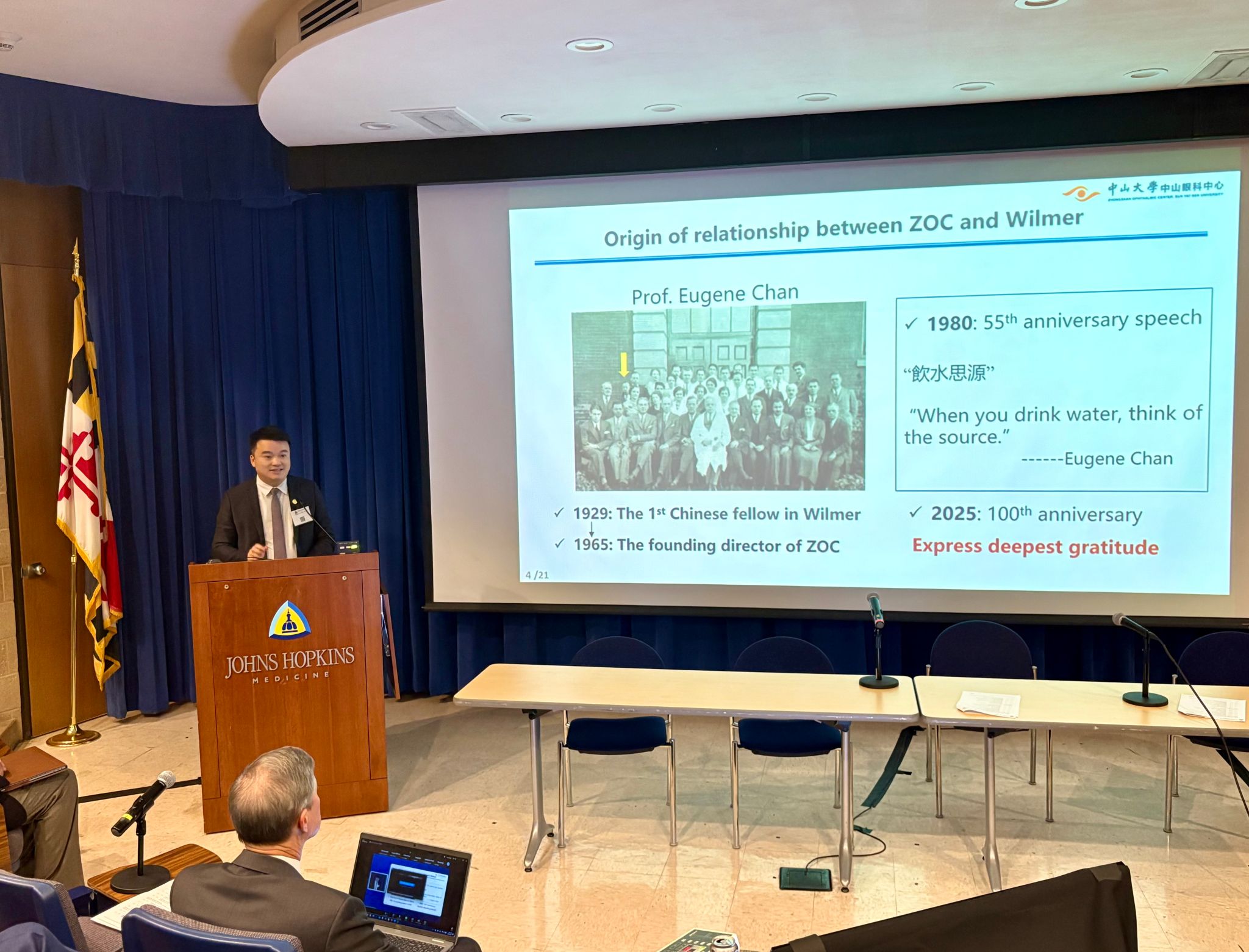 Prof. Haotian Lin highlights the century-spanning collaboration between Zhongshan Ophthalmic Center (ZOC) and Wilmer Eye Institute during the lecture.