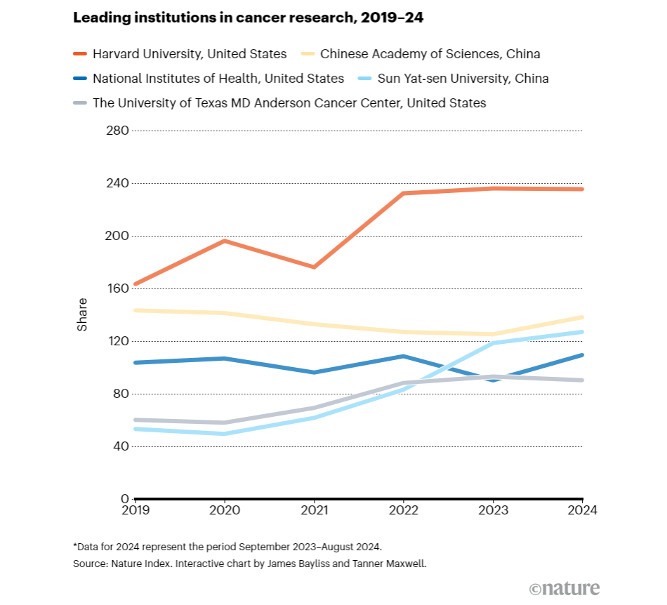 China has surpassed the United States to become the world's leading contributor to high-quality cancer research for the first time, according to the 2025 Nature Index-Cancer supplement released recently. Sun Yat-sen University (SYSU) ranked 4th globally among leading institutions in cancer-related research output from January 2019 to August 2024, trailing elite institutions like Harvard University, the Chinese Academy of Sciences, and the U.S. National Institutes of Health. This achievement underscores SYSU's commitment to tackling cancer through innovation and collaboration and its pivotal role in advancing China's rise as the world's foremost contributor to groundbreaking cancer studies.