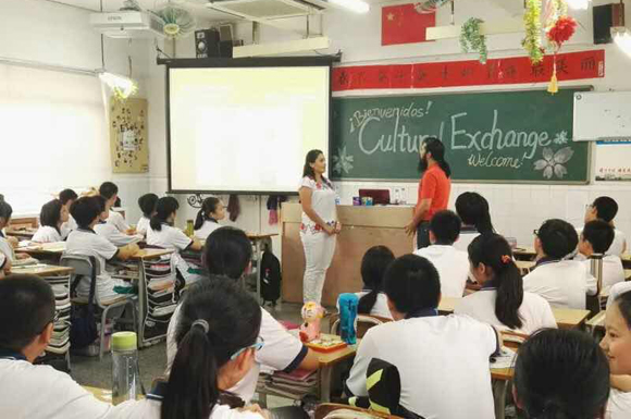 On October 27, 2015, a group of Sun Yat-sen University international students participated in a cultural exchange with a class from the Sun Yat-sen University Affiliated Middle School. Four international students and one international staff member participated in the event, which included games, songs, and presentations. “After the success of the recent cultural exchange trip to Jiangkou High School in Zhaoqing City, it seemed natural to conduct a similar activity in our Affiliated Middle School,” said Wu Xiaoyan, director of the Office for International Students’ Affairs (ISO). Upon arrival, the energy and excitement in the classroom were palpable for the international group. “BIENVENIDOS CULTURAL EXCHANGE” was written on the blackboard in an elaborate and multi-colored sign.