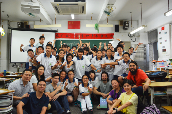 After the presentations were finished, the class’s teacher offered his heartfelt thanks to the international visitors. The visitors were given small gifts and notes that the students had prepared for them, and students, visitors, teachers, and parents alike gathered for a large group photo. The event was another successful exchange, appreciated by all parties for the exposure it gave them to new cultures and backgrounds. “I often see Chinese middle school students in our campus, but it was so interesting for me to actually be in their classroom and see how they study,” said Ian. “I felt like the students were really excited to get a chance to talk to people from different countries. I hope we get the chance to have another exchange soon.”