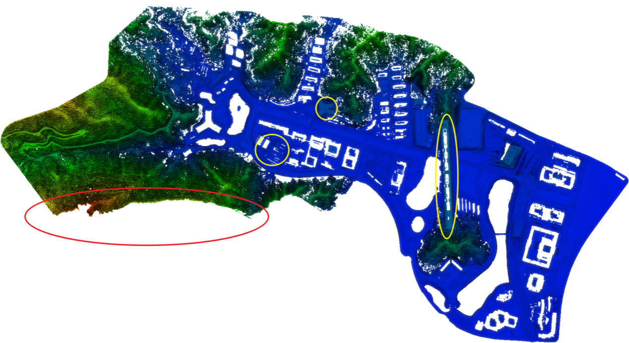 Ground points of Zhuhai Campus filtered by other commercial software show limitations including missing sloped terrain (red circle) and incomplete removal of buildings (yellow circle).