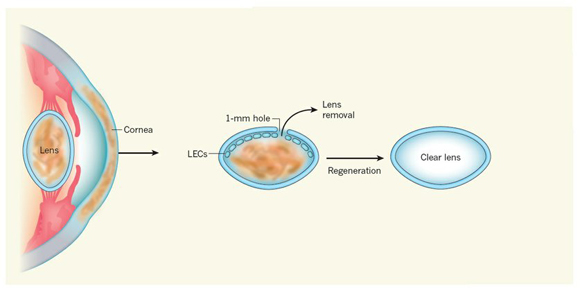 Cataracts are normally removed and replaced with artificial implants. Lin et al. devised a minimally invasive method for lens removal, which left lens epithelial stem cells (LECs) intact. These LECs regenerated the lens in rabbits, macaques and children, eliminating the need for implants.