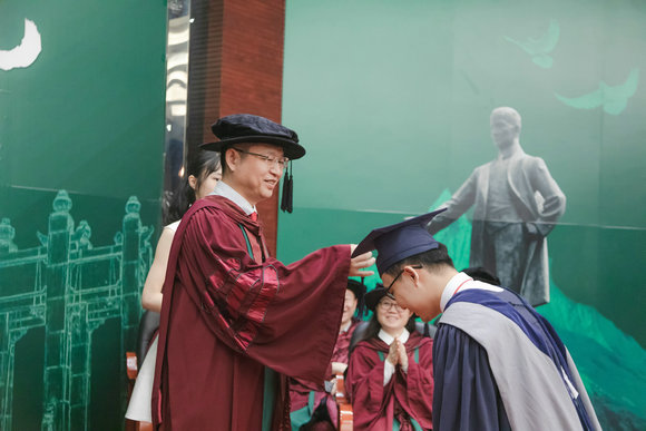 The graduates went onto the stage in turn. Dean Su Chengyong turned the tassel for the degree recipient, presented the graduation booklet, shook hands and took a photo with every graduate.