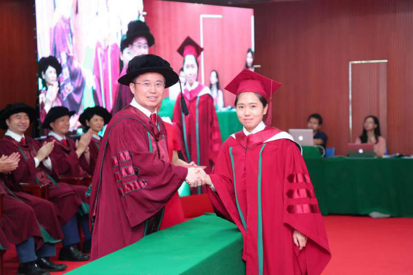 Dean Huang Yao is presenting the graduation booklet to the master’s degree recipient.