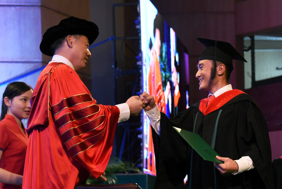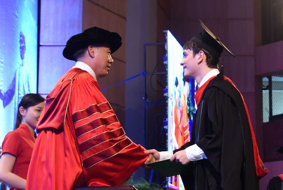 William from the School of Chinese as a Second Language receiving his bachelor’s degree from SYSU President (Photo by Jin Feng)