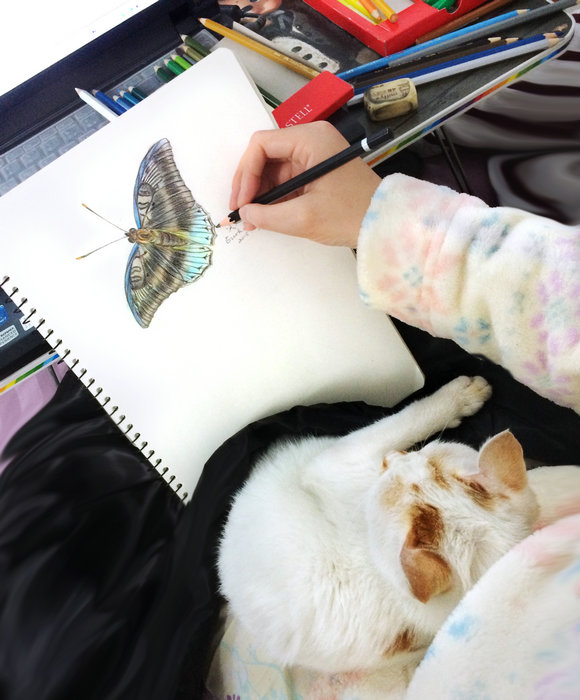 Zhu Lin is drawing a butterfly with colored pencils, embracing her pet cat with a nickname "wild horse"
