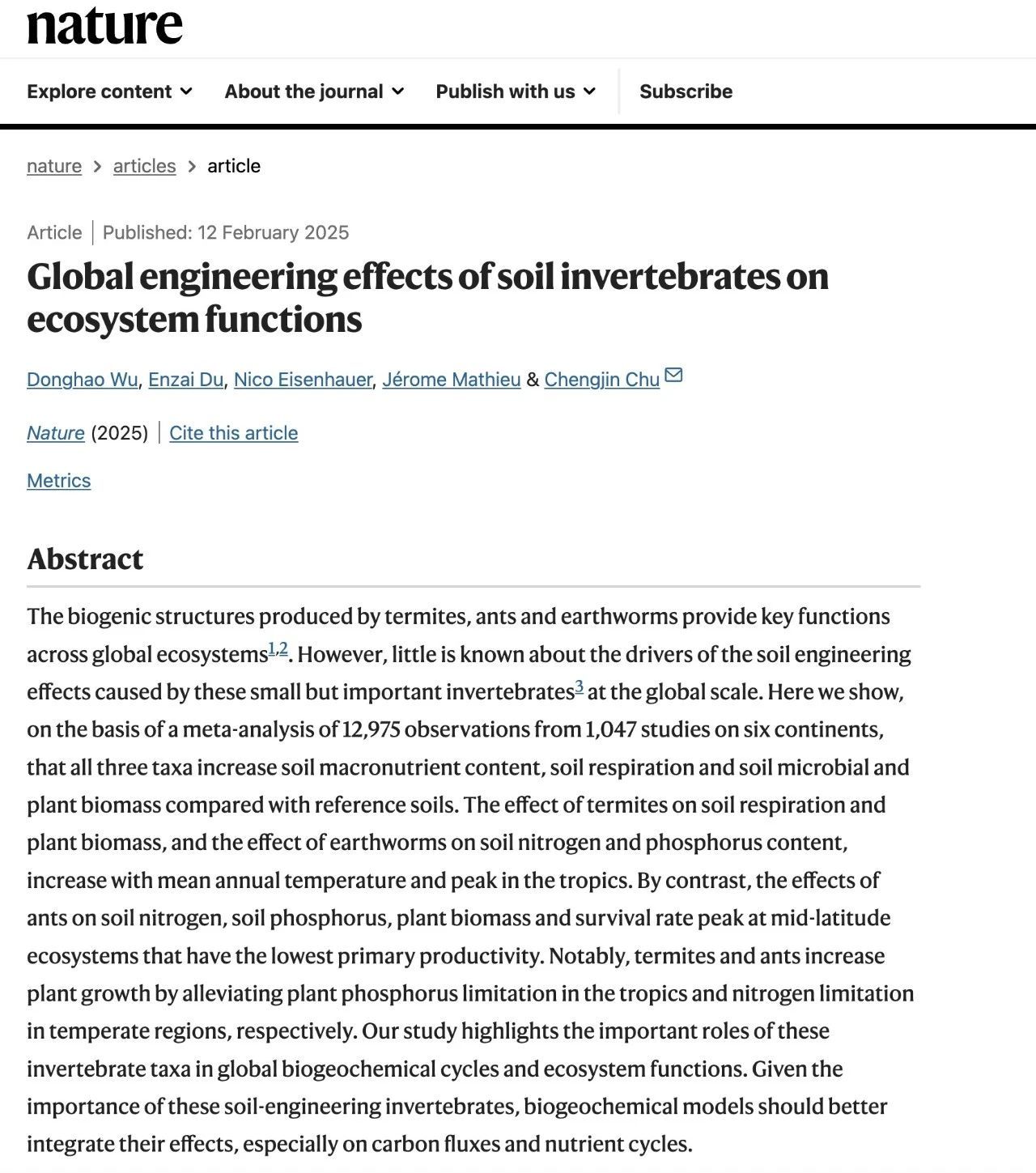 They found that, on a global scale, the soil activities of termites, ants and earthworms can significantly boost the levels of key soil nutrients, such as carbon, nitrogen, phosphorus, potassium, calcium, sodium and magnesium.