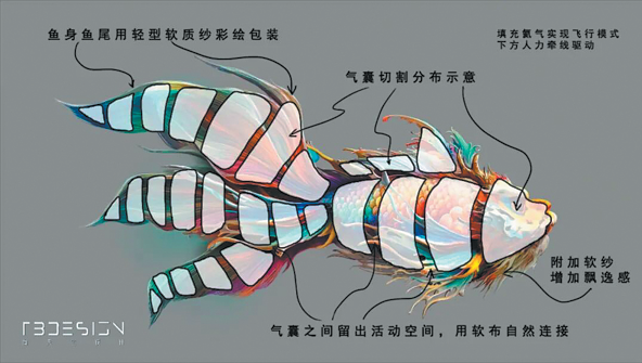 A design graphic shows how the lantern uses soft gauze and airbags to create a vivid sense of motion. CHINA DAILY